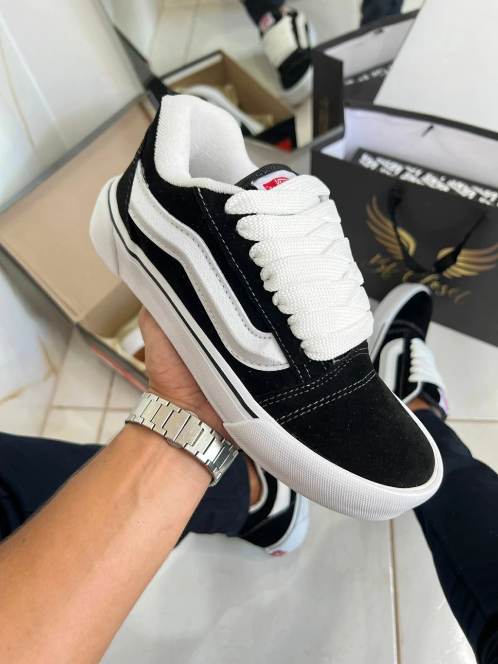 O Vans Knu Skool é uma versão reimaginada do icônico Old Skool, que fez sua estreia em 1998, vinte anos após seu predecessor. Ele captura a essência do estilo skate dos anos 90 com um design robusto e detalhes exagerados que o tornam inconfundível. Este tênis de cano baixo é perfeito para quem busca um visual autêntico e cheio de personalidade.